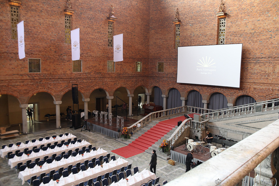 노벨상 만찬식에 쓰이는 식기도 전시되어 볼 수 있었고 만찬장인 불루홀은 어떤 행사준비로 사람들이 악기도 갔다 놓고 분주히 움직이고 있었다.
