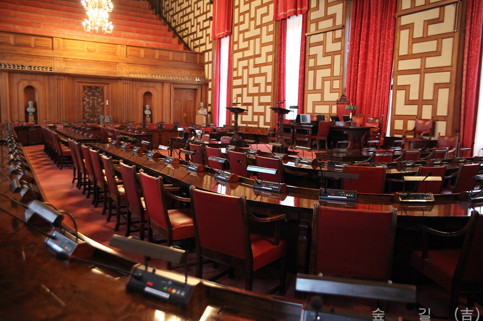 의회 회의장에는 천정에도 그림이 그려져 있었는데 거리가 멀어 그림 내용은 확인이 어려웠다.