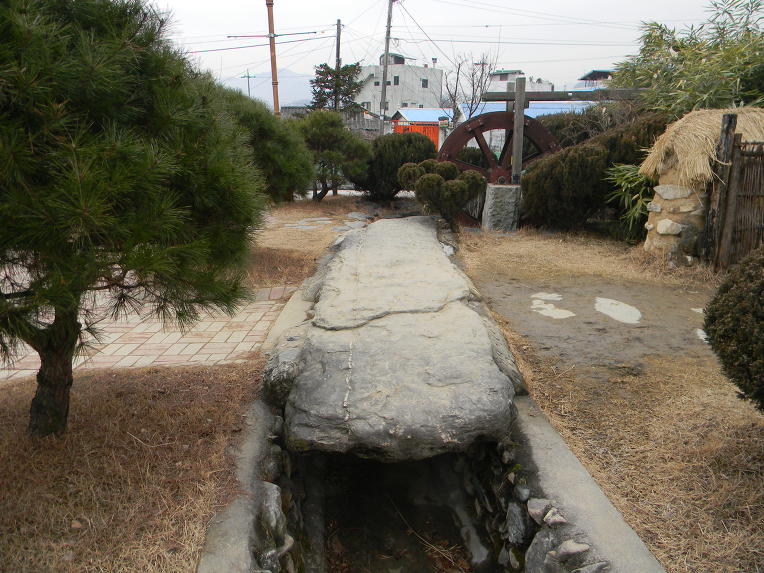 조그만 개천과 물레방아가 있는데, 개천 위에는 넓직한 반석(盤石)이 벌
