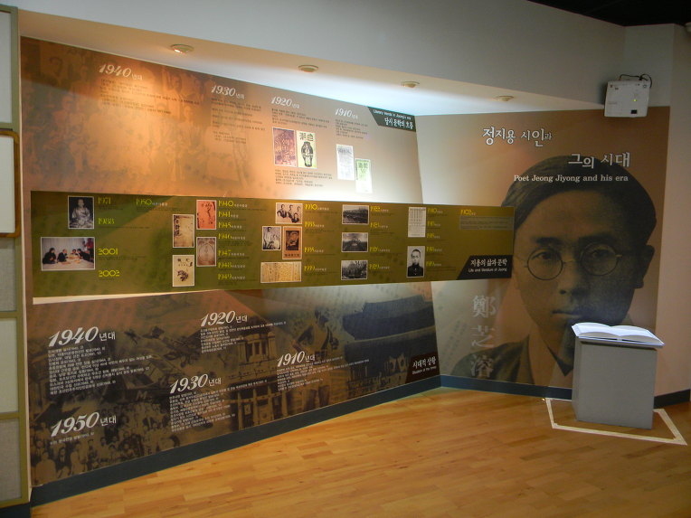 인 문학전시실은 정지용의 인생과 그가 살았던 시대, 문학(향수, 바다와 거리, 나무와 산, 산