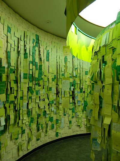일을 염원하며 한 글자씩 남긴 종이가 한 공간