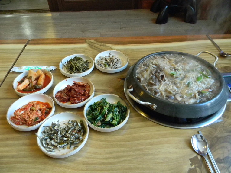전골을 주문하니 김치와 멸치볶음, 게장 등으로 이루어진 밑반찬 7가지가 차려진다. 그