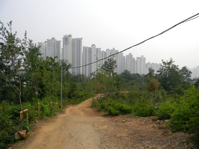 이동했다. 길 남쪽에는 밋밋하게 솟은 키다리 아파트들이 몰려있고, 북쪽은 녹색 물결이