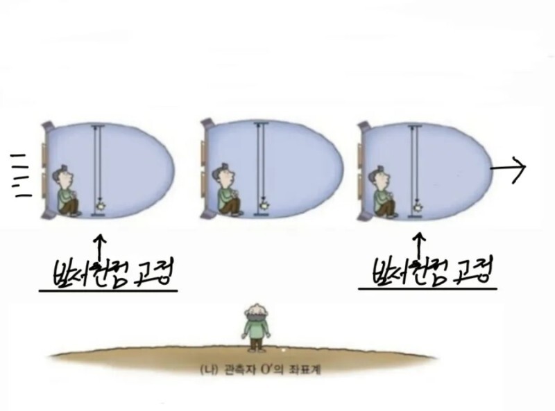 우주선밖에서 *관성계(0-30만km/s) 우주인(b)가 관측한 *(관성) 주행하는 관성계 우주선(a)안에서 빛시계의 시간흐름은