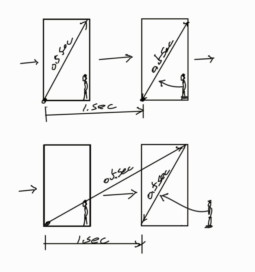 관성계 우주선 밖에서 관측한 빛의 이동경로는 우주선에서 빛이 (0.5초)동안 상승하는 구간에서는 빛의 이동거리가 증가(시간팽창)하는한편