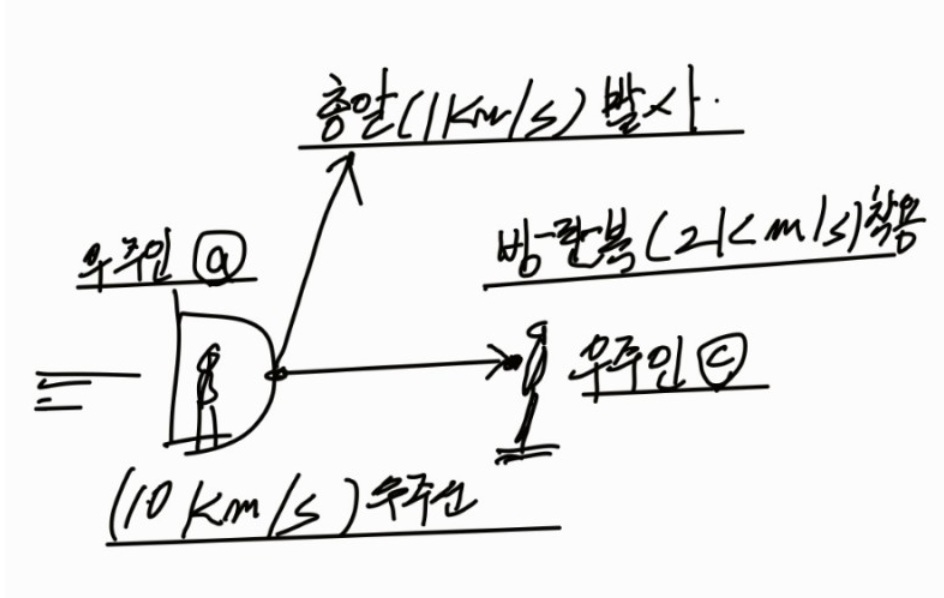 관성계 우주선(a)에서 발사한 총알의 속도(1km/s)크기에 의해서는 어떠한 피해도 입지않고 생존할수 있습니다.