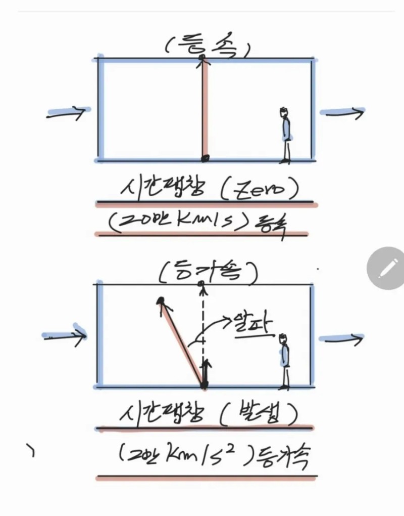 1초동안 빛의 이동거리가 (변해서(증가해서), 시간팽창 물리현상이 결코 발생하는것은 아니며, 우주(비관성계(가속운동계)우주선a안에서는,