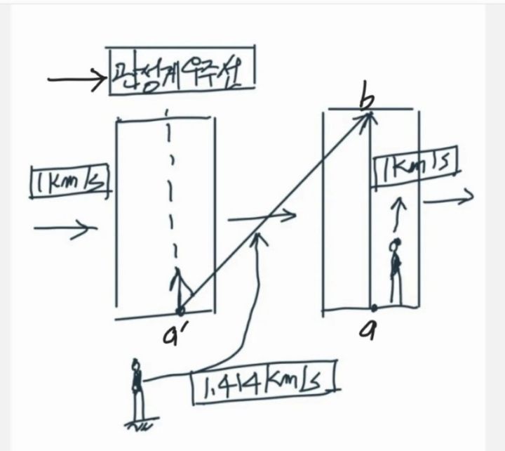 우주선a에서 사선으로(a'-b) 발사한 총알의 실제 이동거리 물리량을