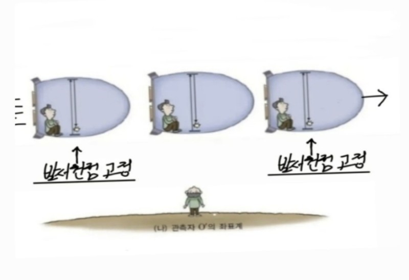 (가속운동계)에서 수직으로 발사한 빛알은,비관성계 우주선에서는 가속하는 가속력에 의해서(가속중력(관성력)을 받으며 (가속중력(관성력)크기에 비례해서 물리적으로 빛의 궤도는(휘어지며,(시간팽창)이 발생하게됩니다.