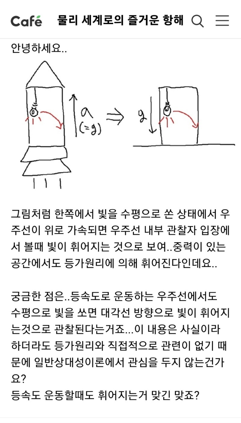 (가속도) 비관성계 우주선에서 수평방향으로 발사한 빛의 이동경로는 우주선의 아래방향으로 휘어집니다