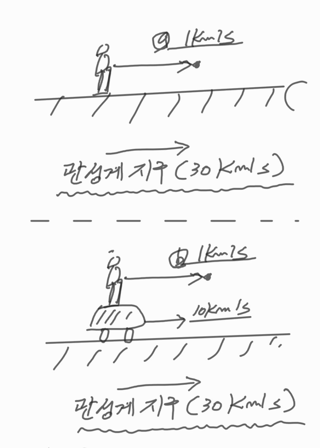마치 *(지구의 공전속도 더하기 자동차의 속도 더하기 총알의 속도)* 크기가 실제 총알의 속도 크기가 된다고 말합니다 .
