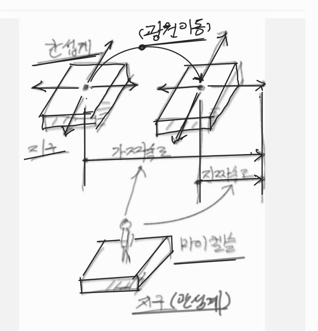 우주선(p)는 우주공간에 절대로 정지해있는것이아니며,