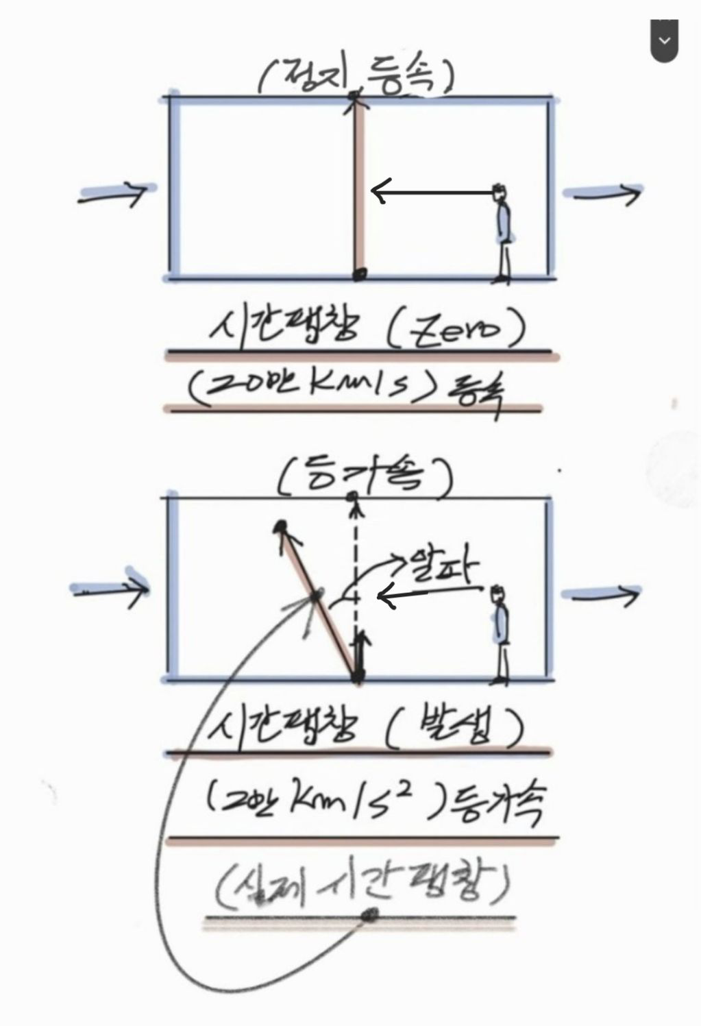 우주선의 등속도 크기가 광속을 넘어 (100만km/s)로 관성 이동하며 우주선에서 관측한 우주 모든 빛의 속도는 항상 광속으로 관측됩니다