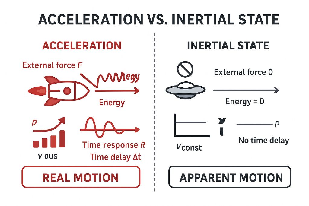 진정한 물리적 운동이란, 반드시 에너지의 흐름과 작용, 즉 가속(加速) 을 수반해야만 한다. 가속이 없는 등속 상태는 단지 이전의 가속 과정에서 얻은 관성(慣性)의 잔류 효과일 뿐, 새로운 에너지 작용이 발생하지 않는다. 따라서 등속운동은 운동의 결과이지 운동의 과정이 아니며, 물리적으로는 정지 상태와 동일한 무작용 상태라 할 수 있다.