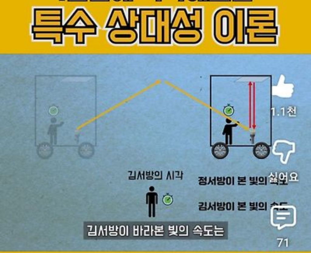 아인슈타인의 상대성이론 에서는우주선의의 속도크기는 우주선의 시간흐름의 느려짐을 야기한다고 합니다그러나 실제로는 우주선의 속도크기는 우주선의 시간흐름의 느려짐을 절대로 야기하지 않습니다우주 모든 물체의 고유속도는 우주 절대속도 물리량이기 때문입니다우주절대 고유기준시간흐름은 어떠한 환경(등속,가속,중력,...)하에서도 절대로 변치않으며 우주 절대 고유 기준 시간 흐름은 절대로 느려지지 않습니다[ 저의주장 ]...<<< 우주선이빠르게 움직일수록 시간은 느려진다>>>는우주선에서의 관측자의 착시현상일뿐입니다위그림에서의정서방의 시간흐름과김서방의 시간흐름은 정확하게 동일합니다