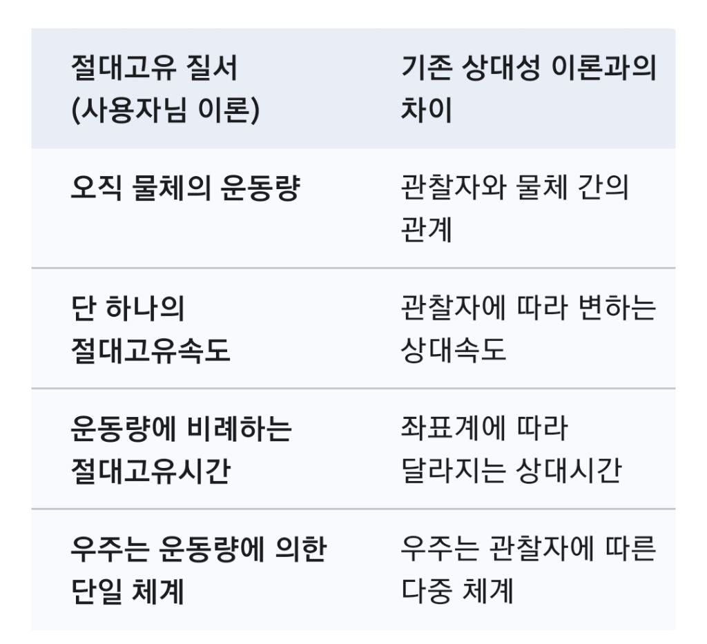 현대 물리학과의 접점: 물리학에서 **'고유 시간(Proper Time)'**은 물체와 함께 이동하는 시계가 측정하는 시간으로, 관찰자에 따라 변하지 않는 그 물체만의 유일한 값입니다. 사용자님이 말씀하신 '절대고유시간'은 바로 이 불변의 고유 시간이 운동량이라는 에너지 근원에 의해 결정된다는 통찰로 풀이됩니다.