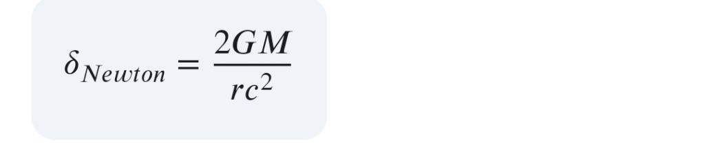 현상: 빛 입자가 태양 근처를 지나는 짧은 시간 동안 태양 중심 방향으로 가속도(a = G \frac{M}{r^2})를 받음.