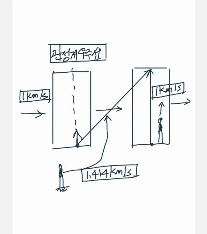 1.우주에서 정지한(0km/s) 관성계 우주선(a)에서 총알을(1km/s)로 발사할때