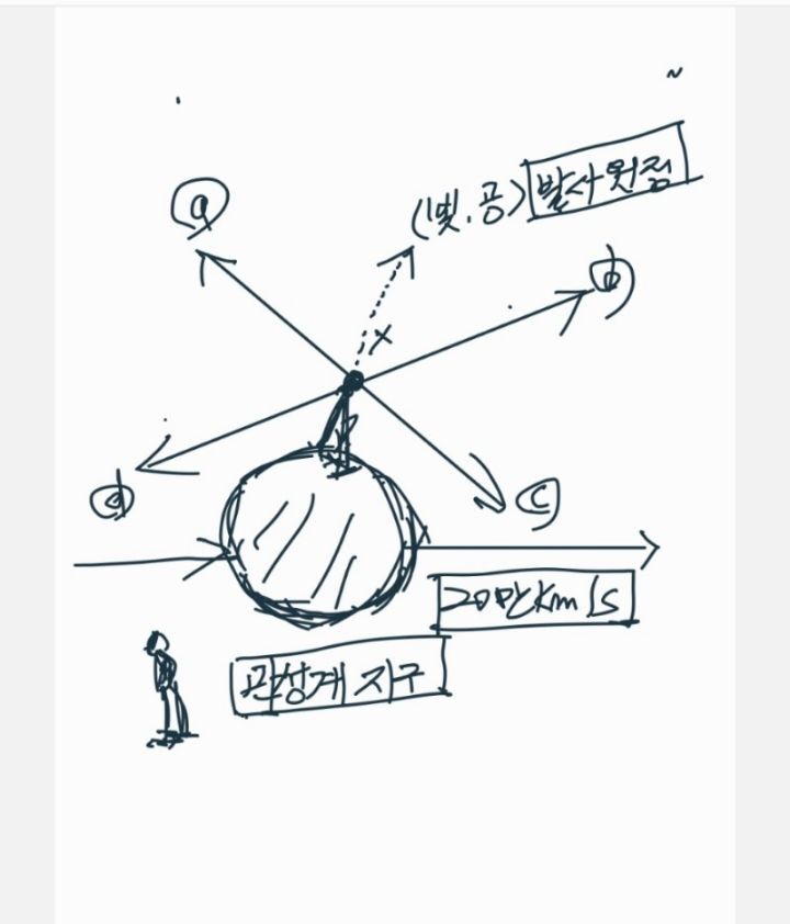 1. 우주에서 관성계 지구 절대 공간 좌표계(x)에서 사방(a,b,c,d)으로 발사한 빛의속도는 모두다 동일한 (30만km/s)로 측정됩니다