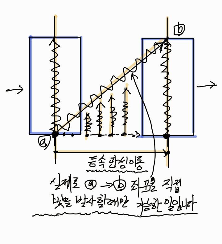 실제로 a좌표에서 b 좌표로 직접적으로 빛을 발사할때에만 가능한 물체의 고유(속도,운동량,..) 크기의 물리량이 발생합니다