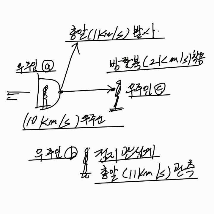 관성계 우주선(a)에서 발사한 총알의 직격탄(11km/s)을 받아 생존할수가 없습니다