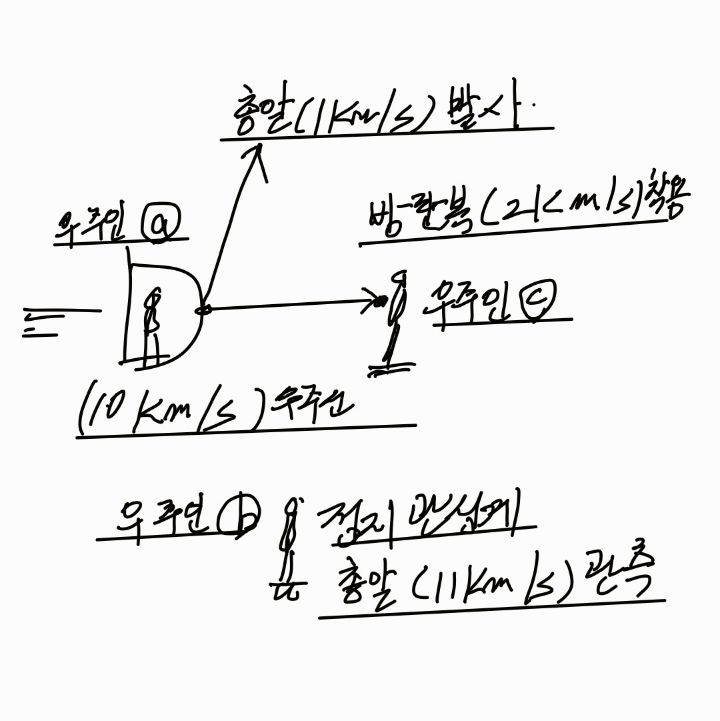 관성계 우주선(a)에서 발사한 총알의 속도(1km/s)에 의해 어떠한 피해도 입지않고 생존할수 있습니다