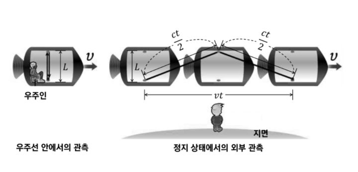 결국 우주선 밖에서 우주인(b)가 관측한 실험결과는
