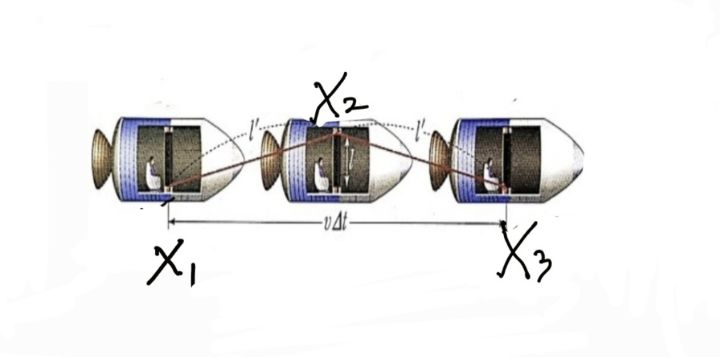 (ㄷ)우주선(a)의 좌표(x1)에서 ->우주선(b)의 좌표(x2)로 반사되어 ->우주선(c)의 좌표(x3)로 도착한 빛의 이동시간은 (3)초가 흐릅니다