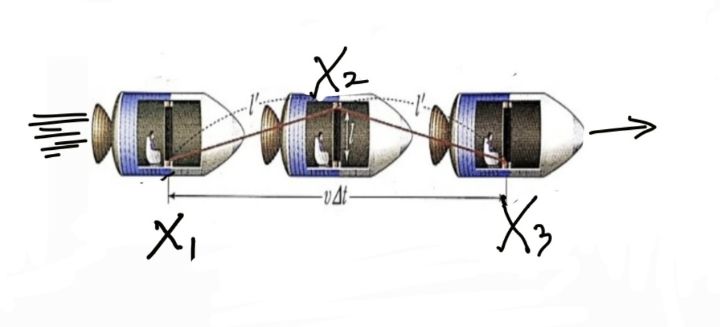 우주선 (a,b,c)에서 제각각 관측한 빛시계의 좌표(x1->x3)로 발사한 빛의 이동시간은 (3)초가 동일하게 흐르는것으로 관측이됩니다