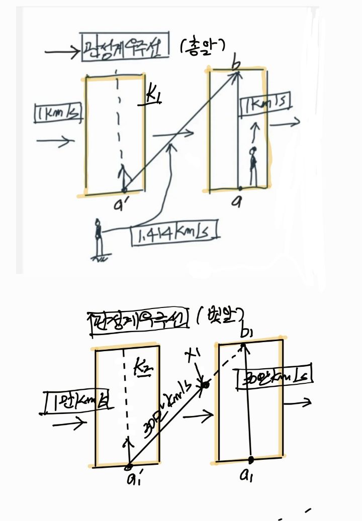 실제로 (10km/s)로 관성 이동중인 우주선(a)에서 발사한 총알의 속도가 (11km/s)속도로 관측이 된다고 하면