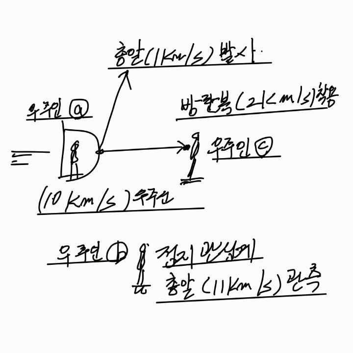 그러나 우주선 정면에 정지한 우주인(c)는 (2km/s) 총알을 방어해주는 방탄복을 착용하고 있어