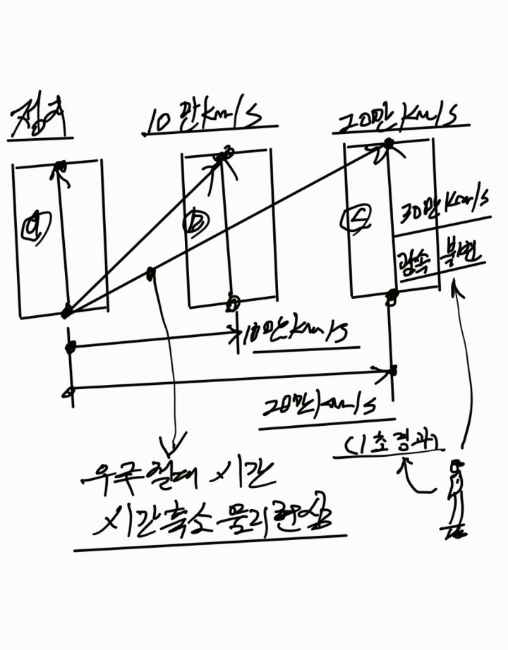 위와같다면 우주선 (a,b,c)의 관성속도 크기가 (0km/s ) -> (10만km/s) -> (20만km/s)로 증가함에 따라서