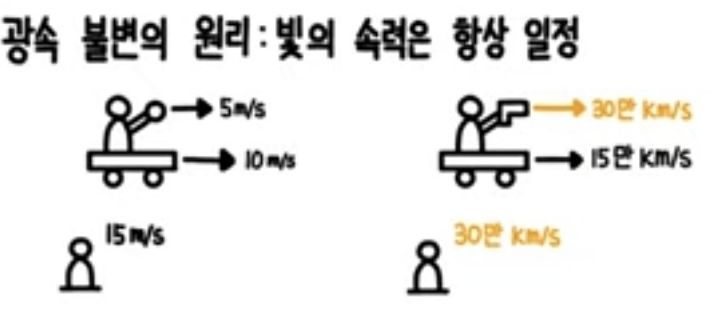 2). 어떤 물체에 어떤 속도를 더하든 그 물체가 빛속도를 넘어서는 것은 불가능하며, 빛속도는 어떤 위치에서 누가 관찰하든 언제나 초속 30만㎞로 일정하다. 앞의 예에서 '빛속도 + 기차 속도 시속 100㎞ = 빛속도'가 되는 것이다. 이것을 광속 불변의 원리라고 한다.*