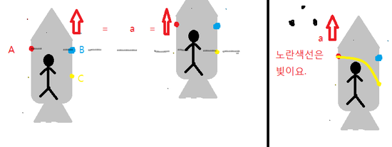 수직으로 가속 상승하는 우주선의 내부 를 가로지르며 수평으로 우주선을 통과하는 빛의 이동 궤도는 어떠한 휘어짐도없이 일직선으로 직진합니다
