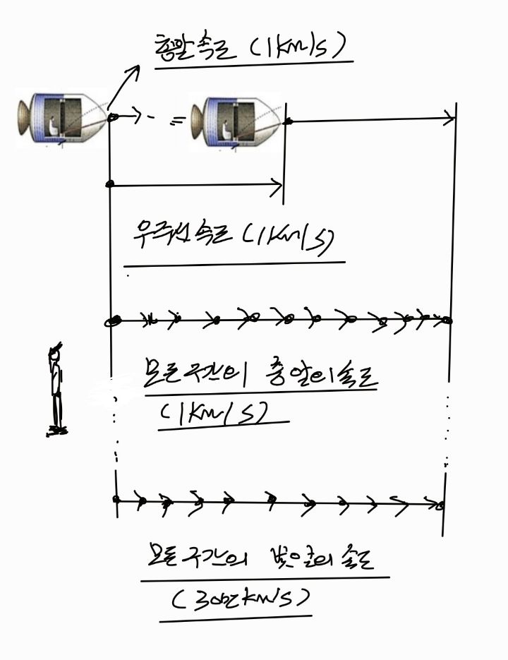 우주에서 관성이동(1km/s)하는 우주선에서 발사한 (총알의속도(1km/s),(빛알의속도(30만km/s),
