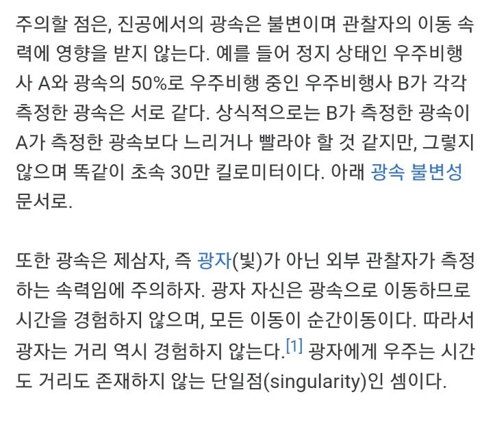[1] <<광자에게 우주는 시간도 거리도 존재하지 않는 단일점(singularity)인 셈이다.>>