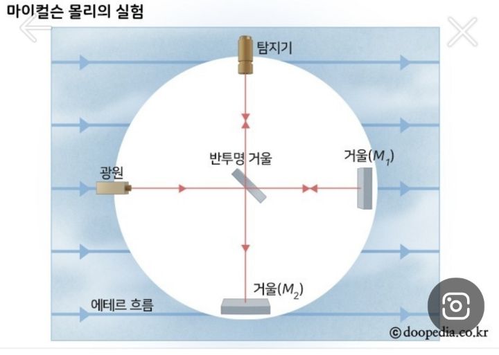 지구 운동방향과 나란히, 그리고 수직으로 광원을 반사시키면 두 광원의 속도 차에 의해 간섭무늬가 생겨야 하는데 이것이 바로 맥스웰의 생각이었고 그것을 정교한 실험장치로 밝혀내려 한 것이 바로 마이컬슨-몰리 실험입니다.