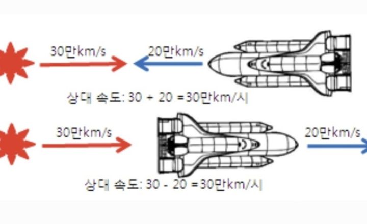 동일하게 우주선에서 발사한 빛알의 속도 역시 우주선으로부터 매초당(30만km/s)속도로 영구히 멀어집니다