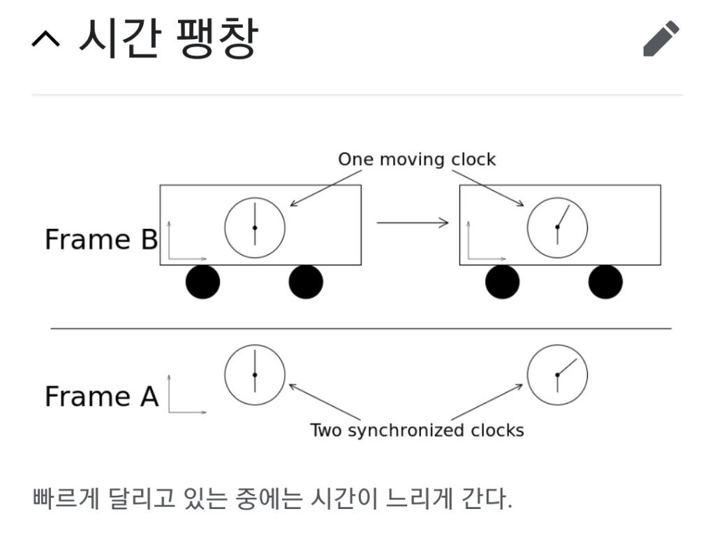 <시간팽창(Time dilation)은 어떤 관성계에서 상대속도를 가지는 다른 관성계를 관측할 때 시간이 팽창된 것으로 관측되는 것을 뜻한다>