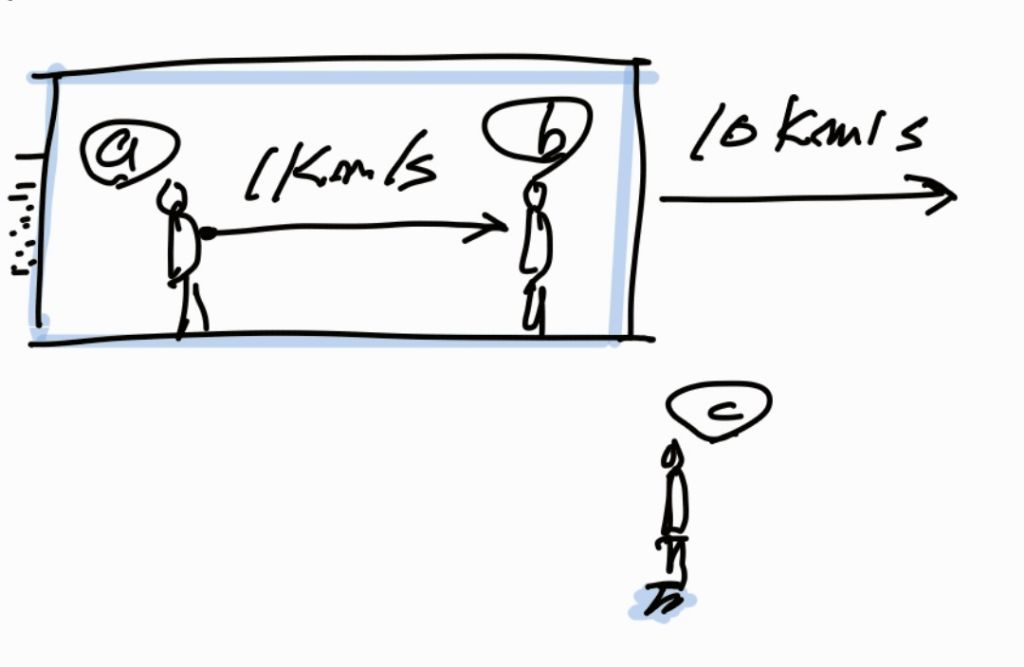 우주 공간에서 (10만km/s)로 날아가는 관성계 우주선(a)에서 총알을(10km/s) 발사할때