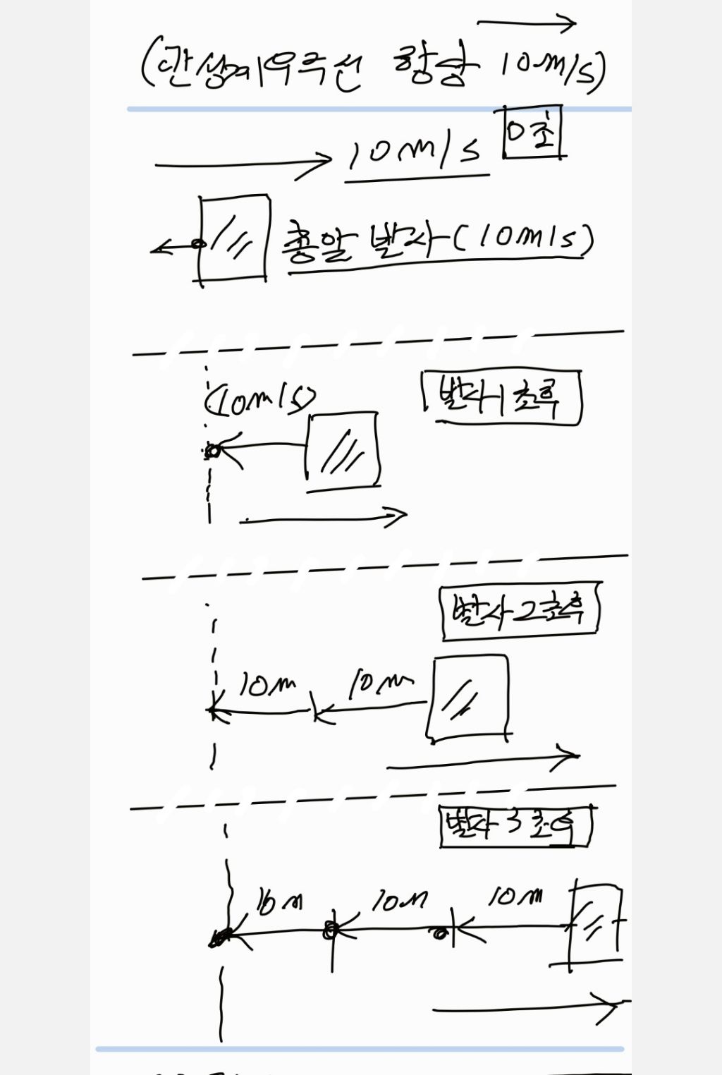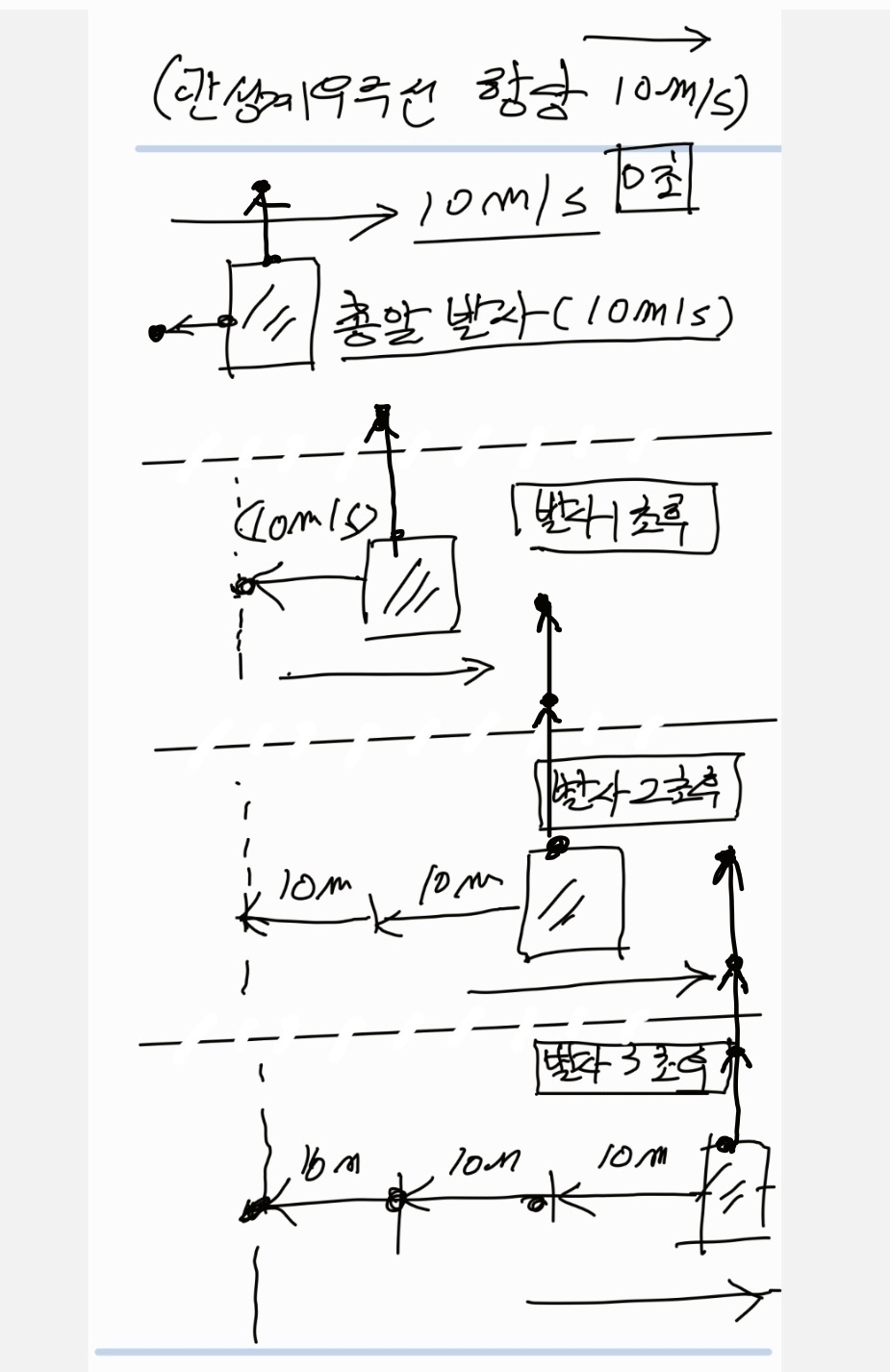 우주 관성계 우주선(10m/s)에서 발사한 총알의 발사속도가 (10m/s)일때