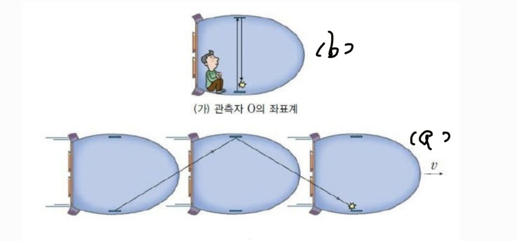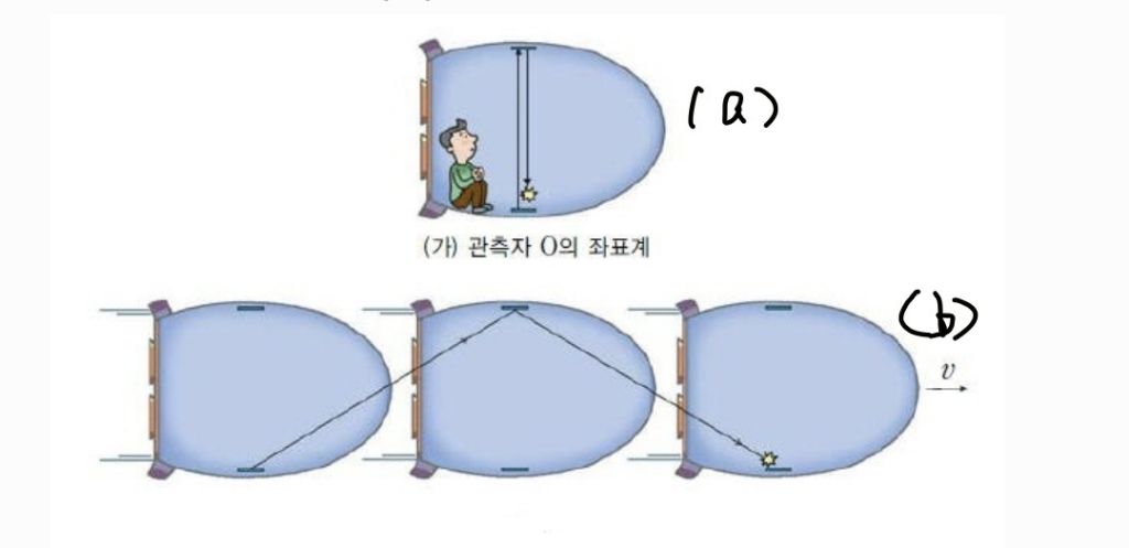 우주에서 동일한 관성속도(20만km/s)로 주행하는 우주선의 (a)와 ,우주선(b)의 두 관성계 우주선에서