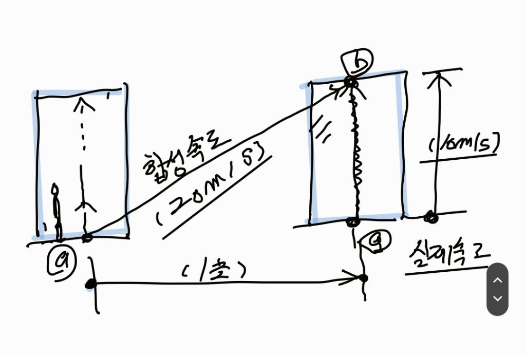 대각선으로 진행하는 총알의 속도(20m/s)는 우주선의 속도와 결합된 총알의 합성속도 입니다