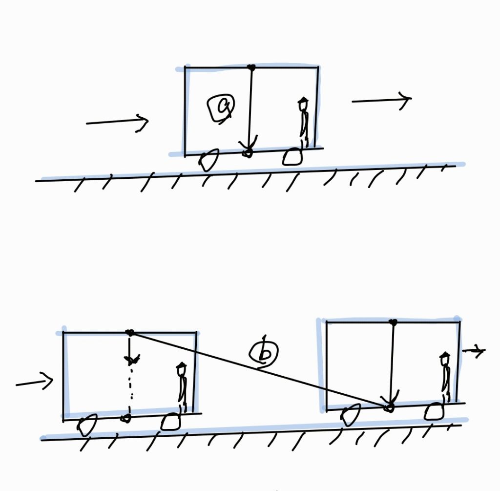 공을 수직으로 낙하하는 실험을 할때 기차바닦까지 낙하하는 공의 이동거리는 관측하는 관측자의 위치에 따라서 제각각 다르게(a)와(b) 두가지 이동거리로 나타납니다