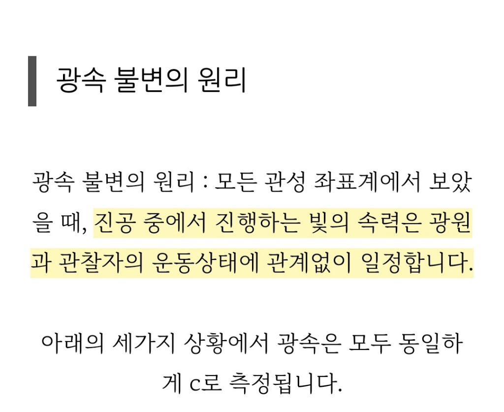 ( 빛의 속도)는 (관측자의 운동 상태나) (광원의 운동 상태)와 관계없이 항상 일정한 속도(c)로 관측된다.)를 따릅니다