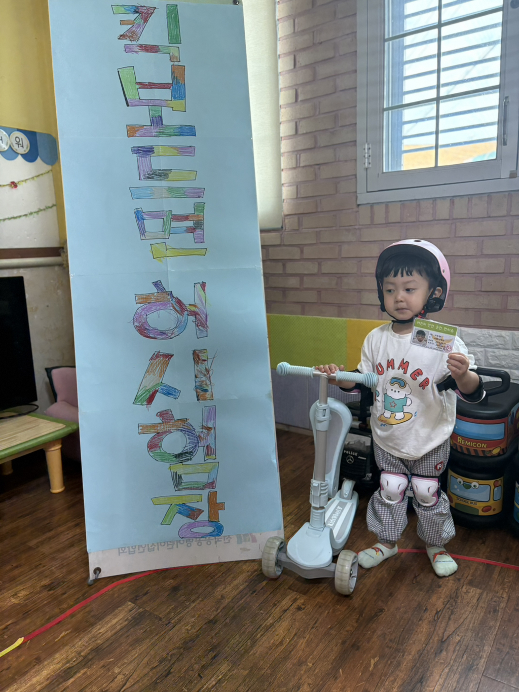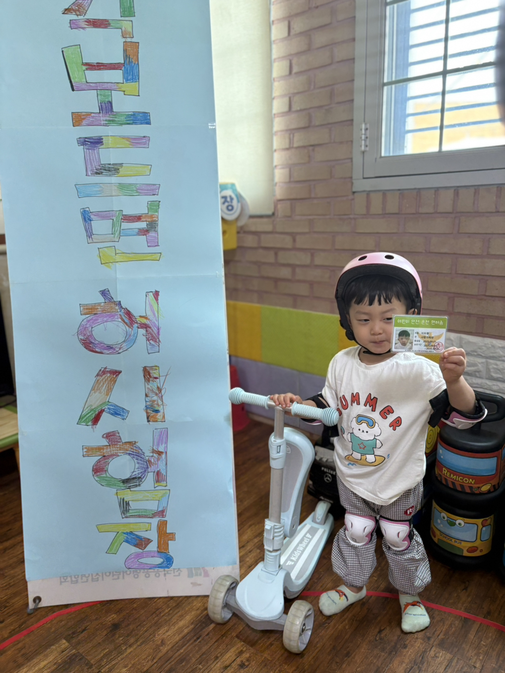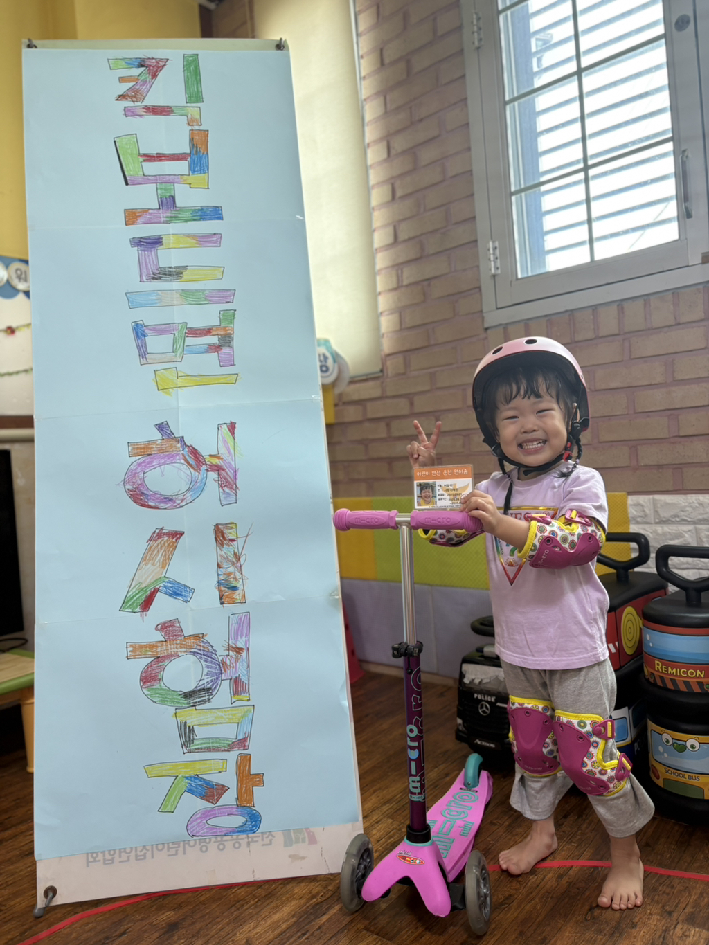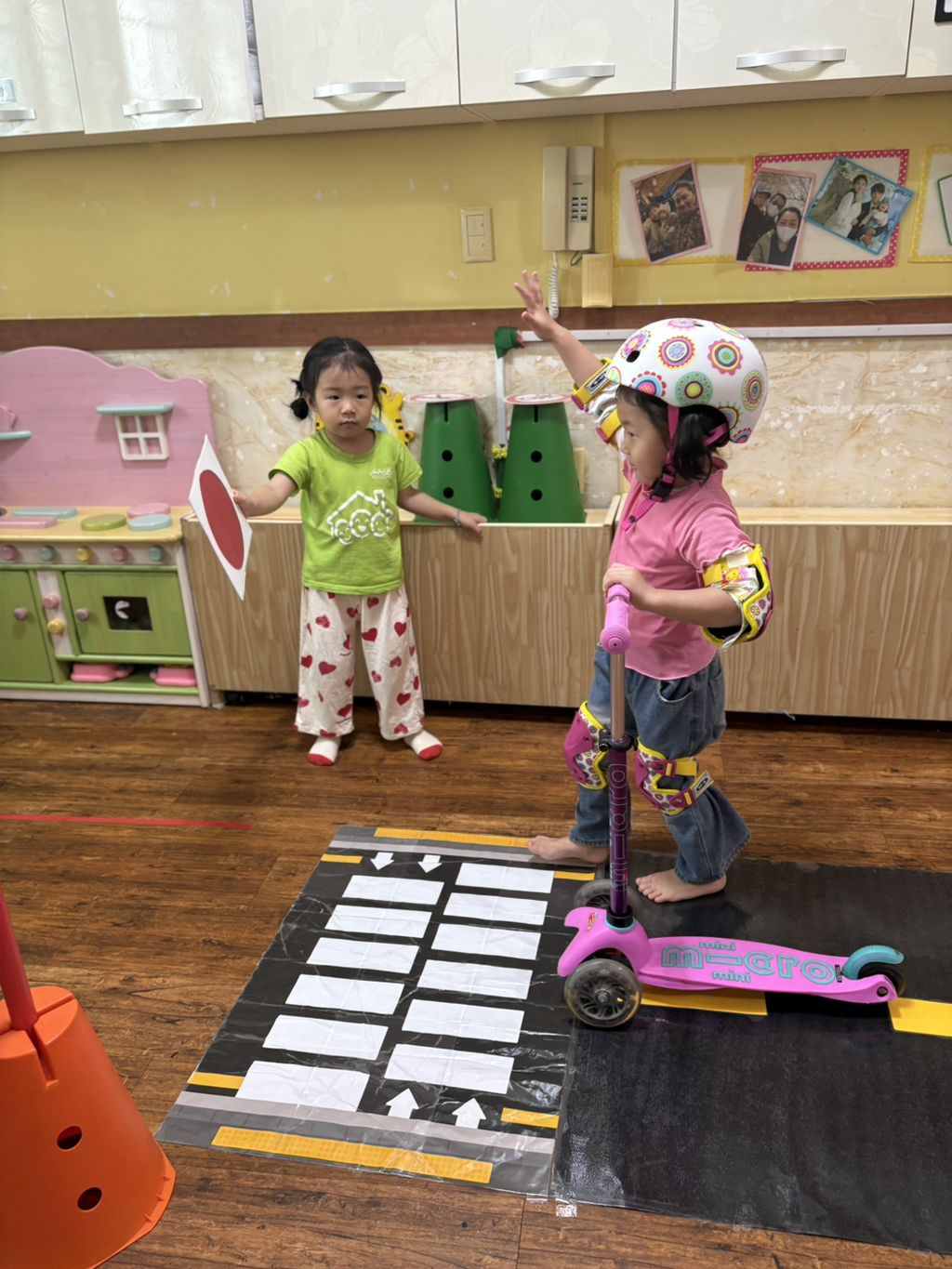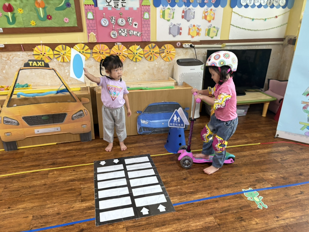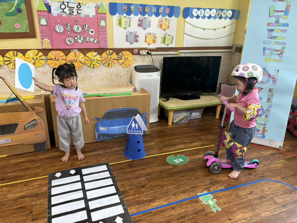일찍 등원한 사랑둥이들이 ‘킥보드 면허 시험장’ 간판을 만들었어요🛴
