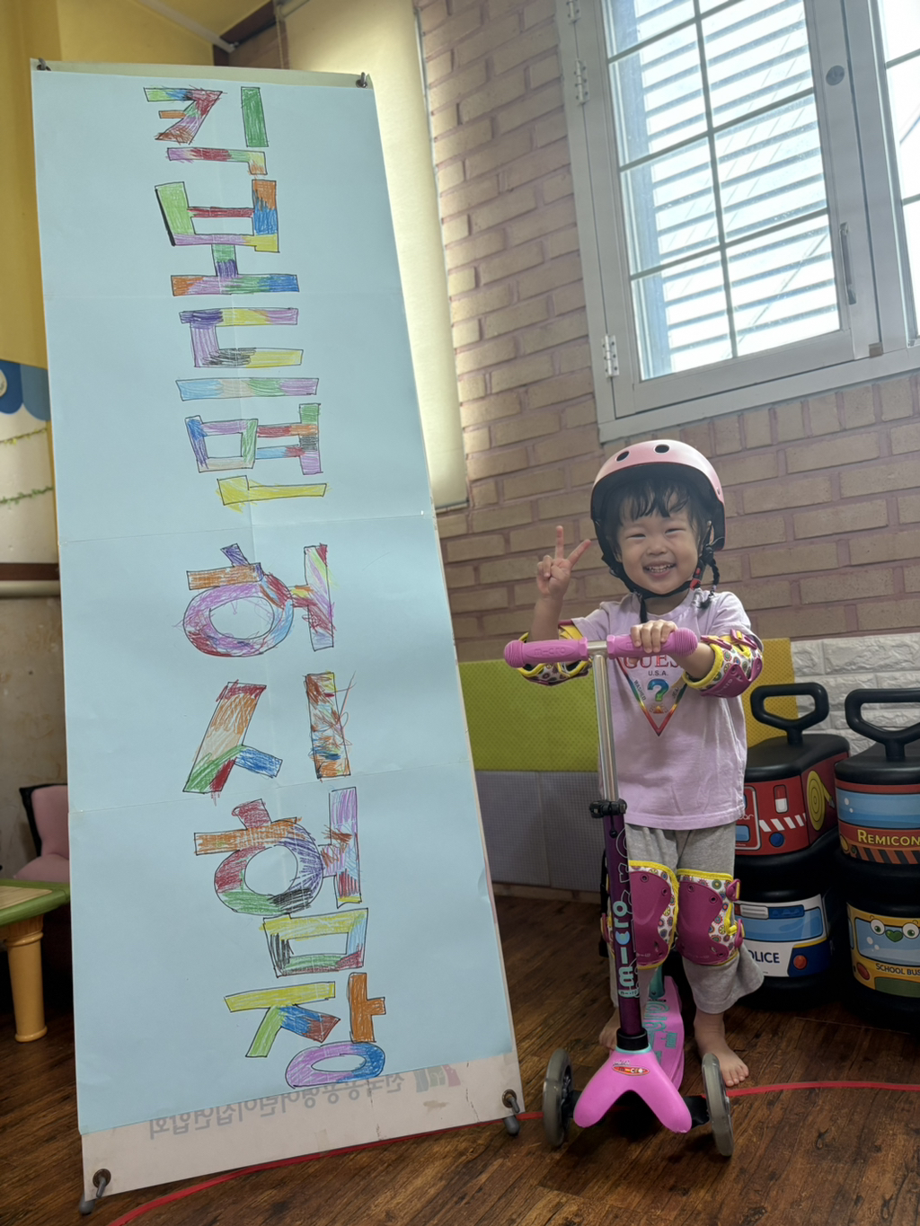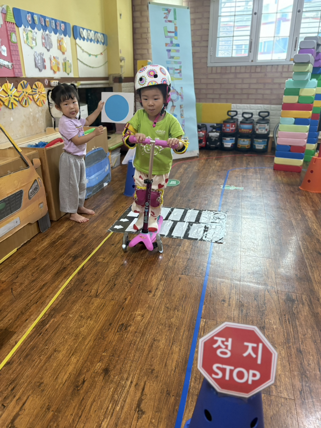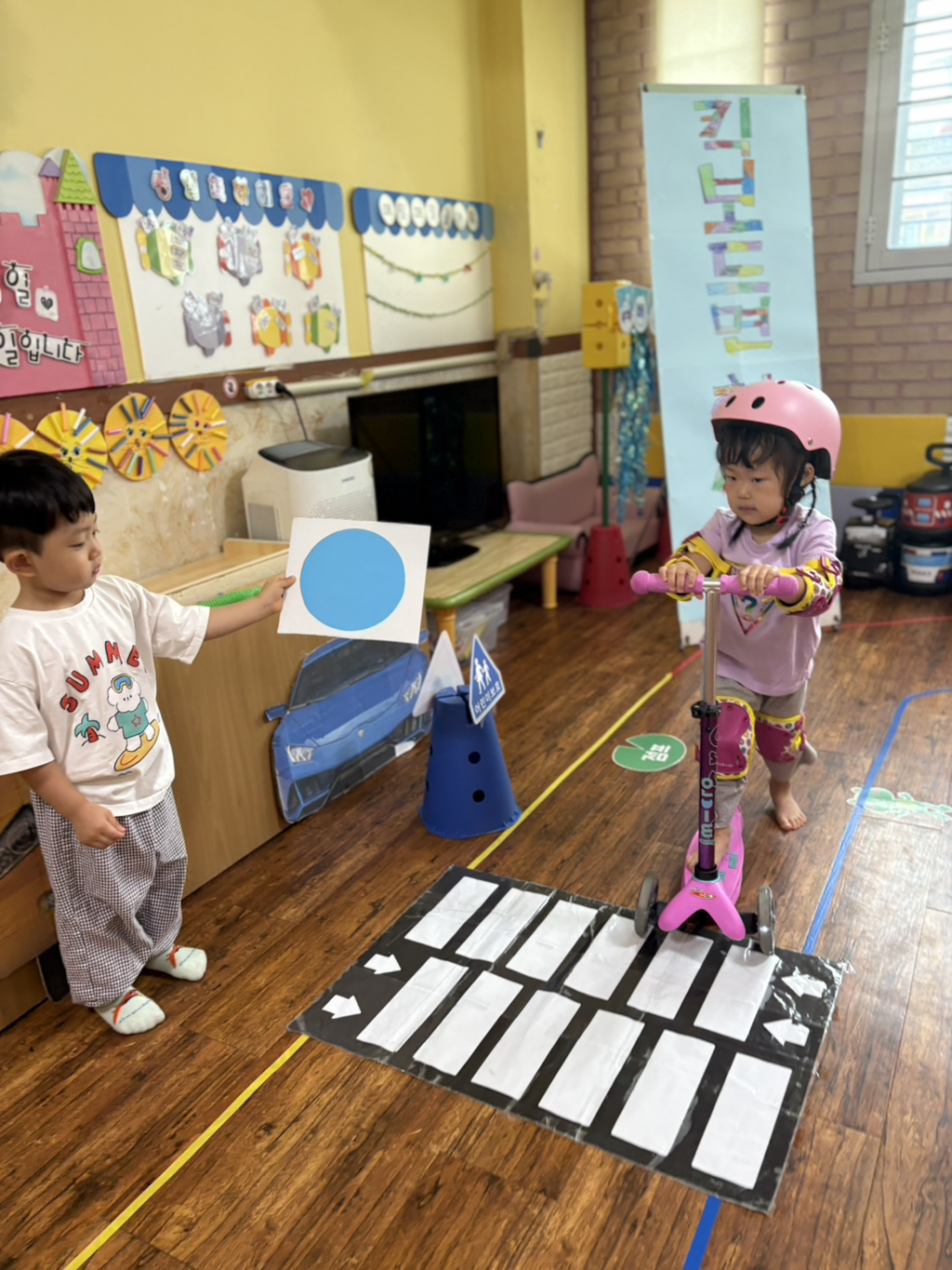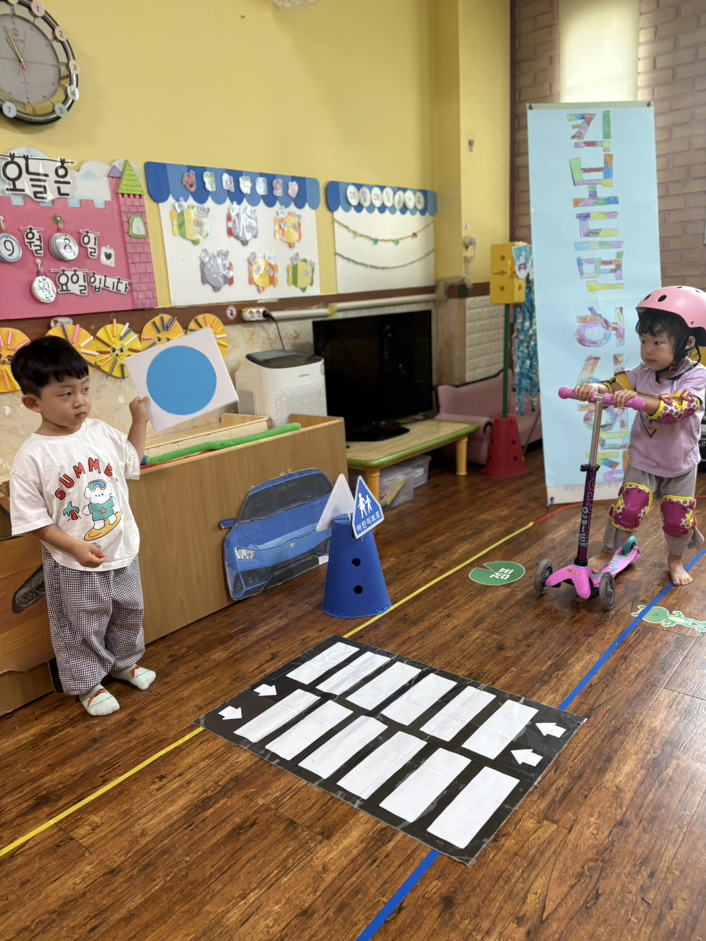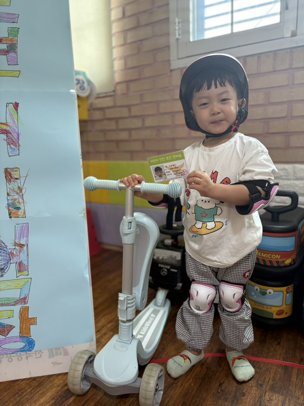 일찍 등원한 사랑둥이들이 ‘킥보드 면허 시험장’ 간판을 만들었어요🛴
