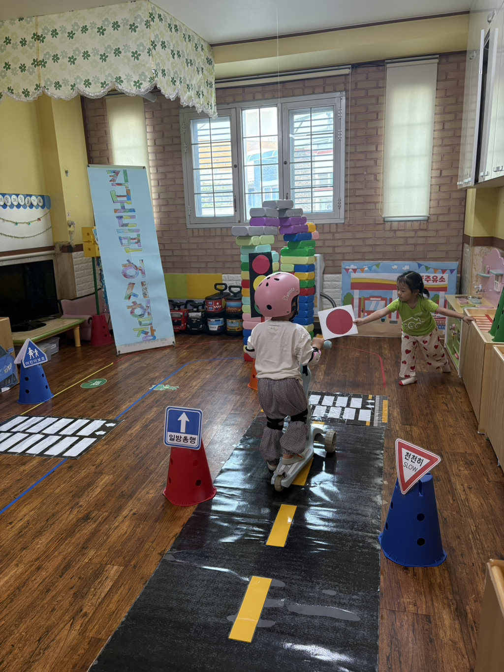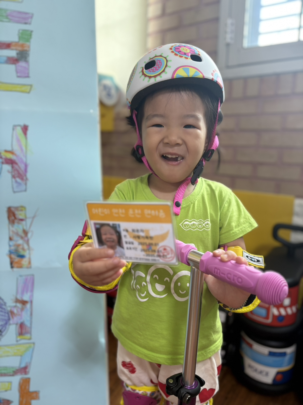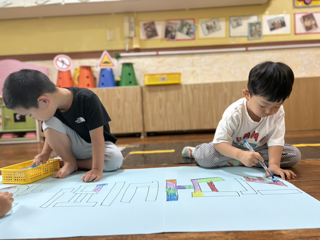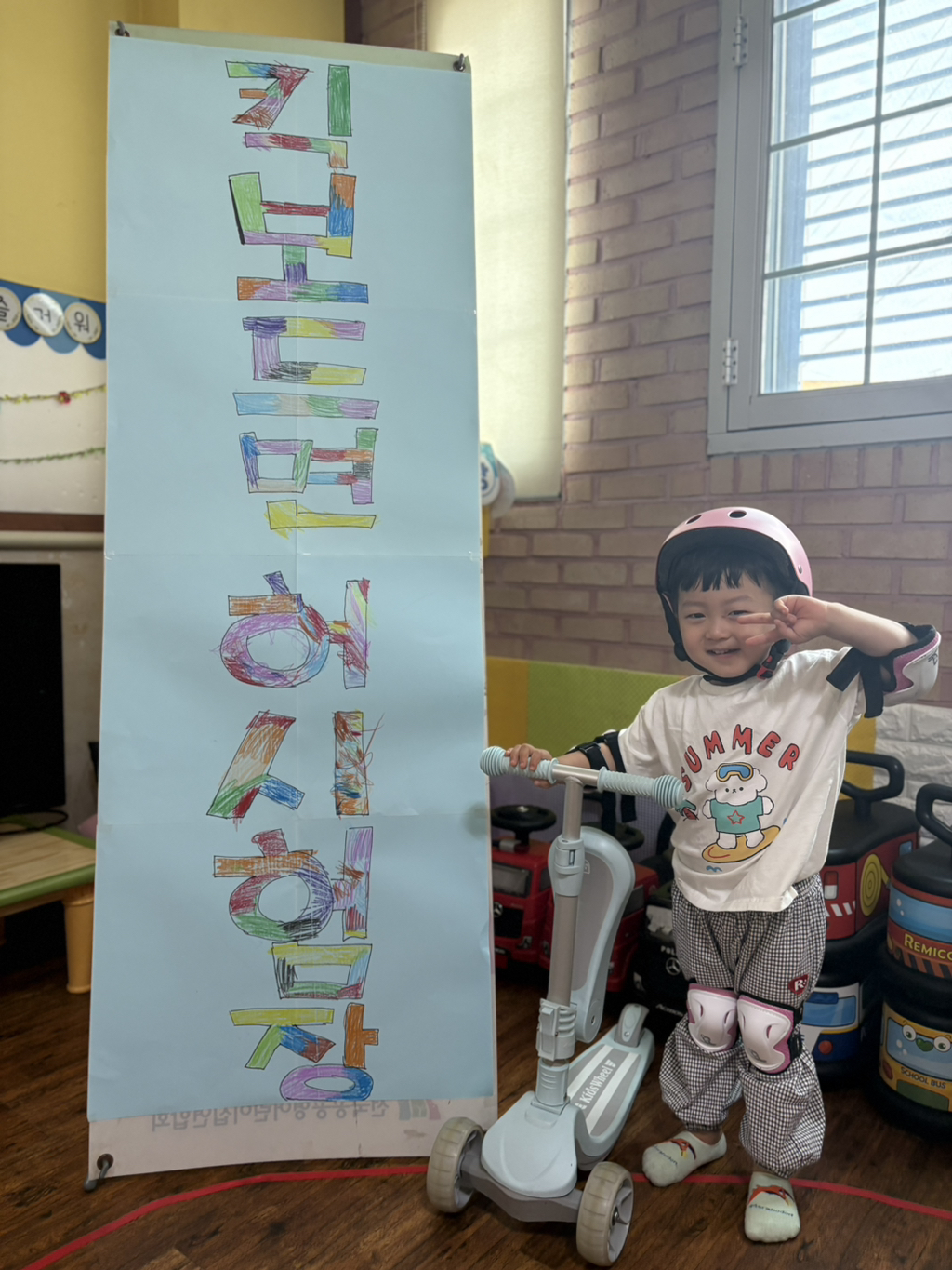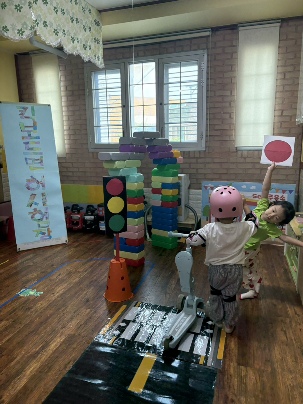 일찍 등원한 사랑둥이들이 ‘킥보드 면허 시험장’ 간판을 만들었어요🛴