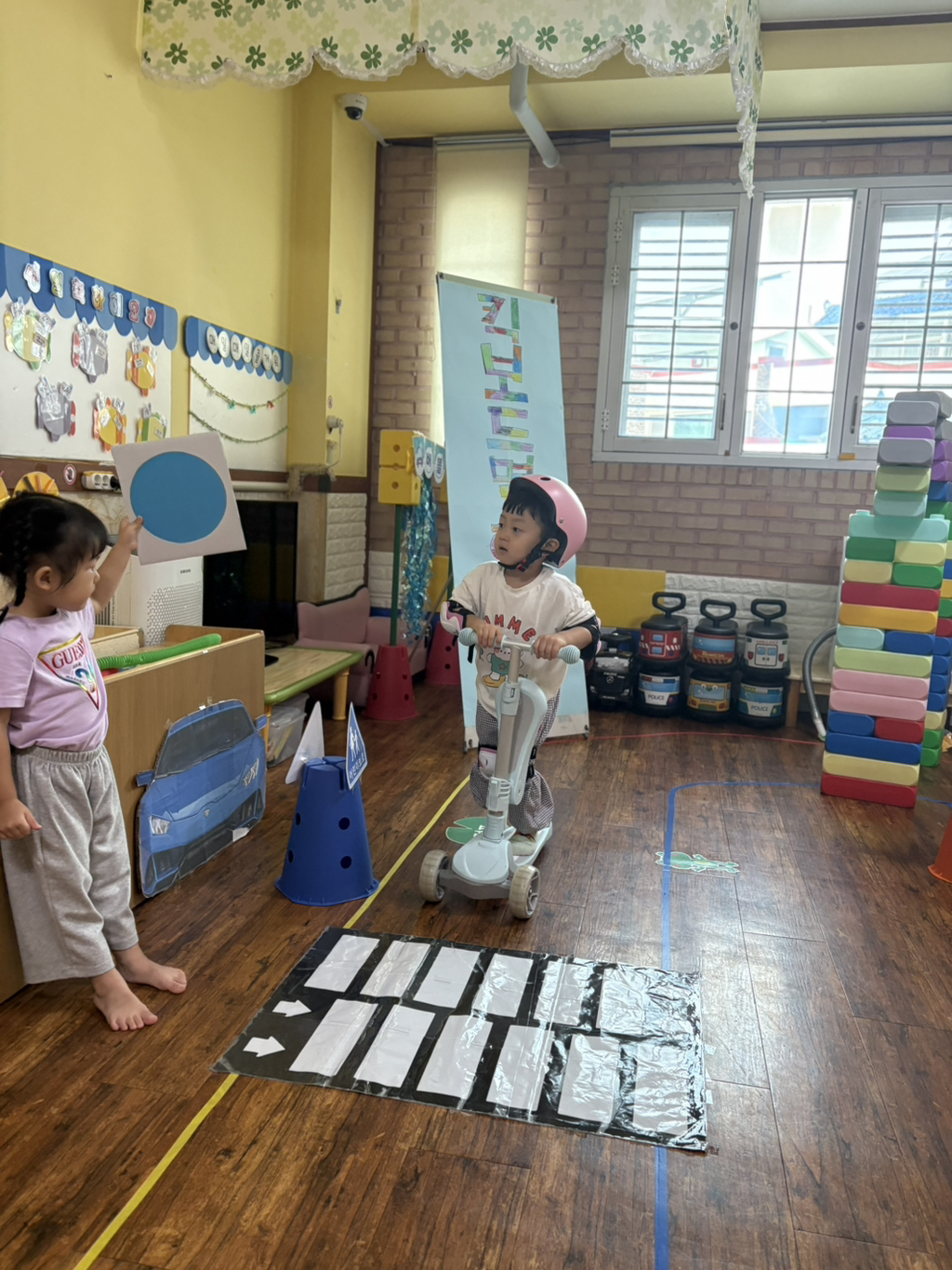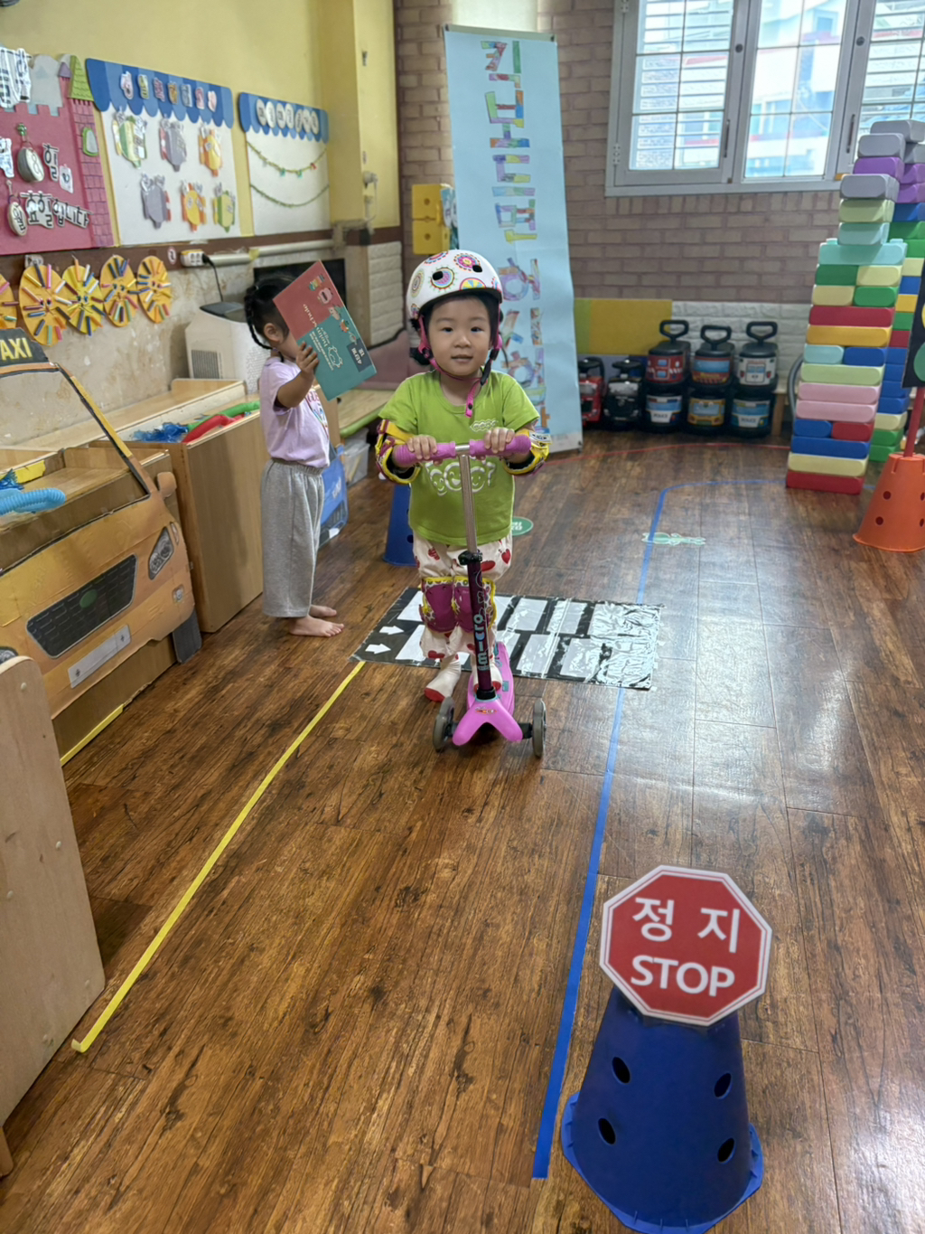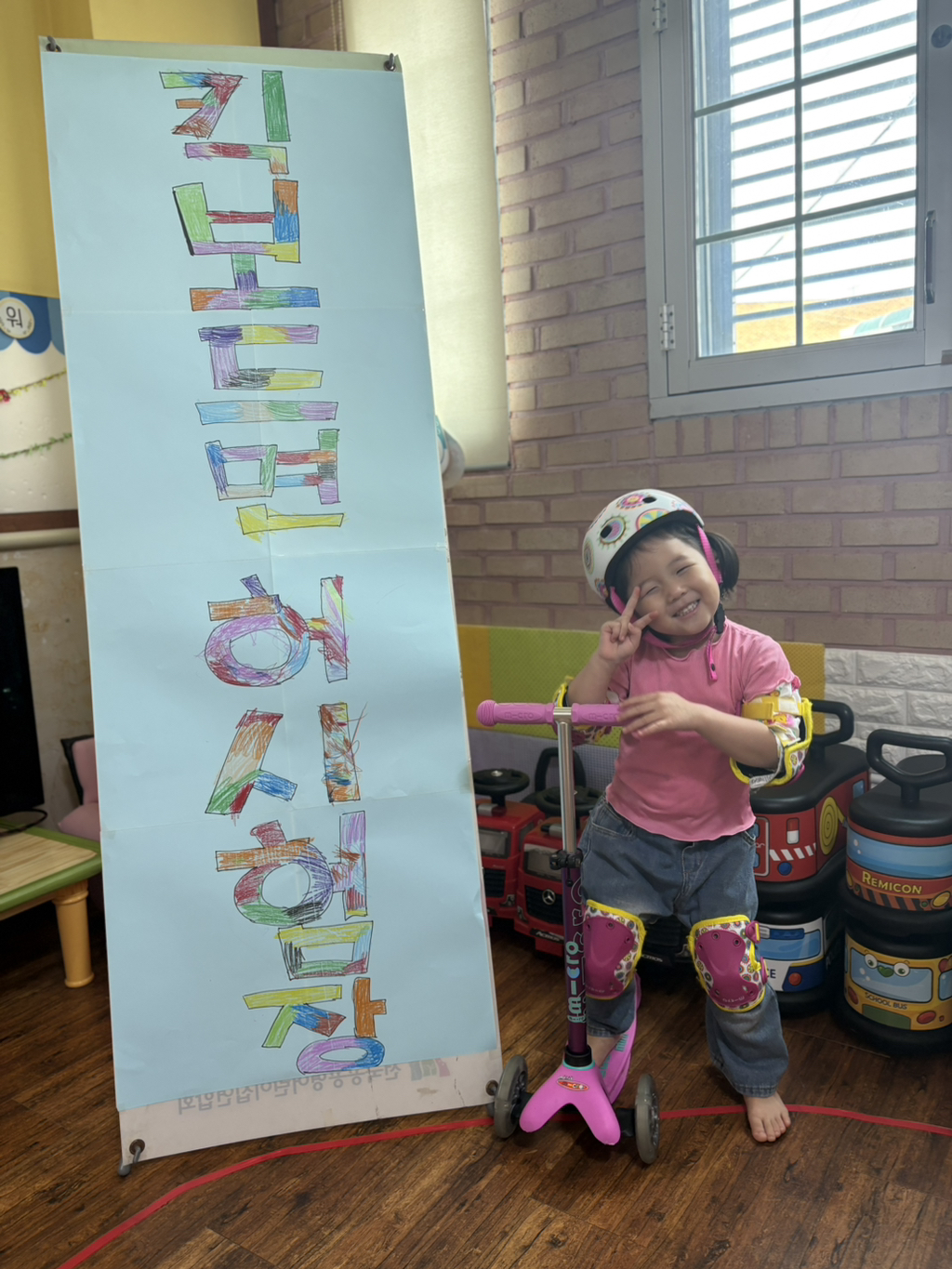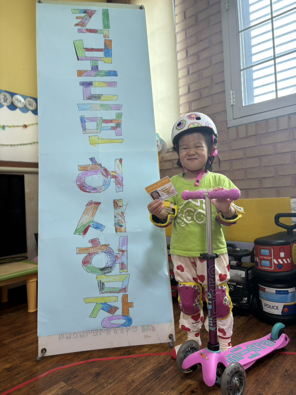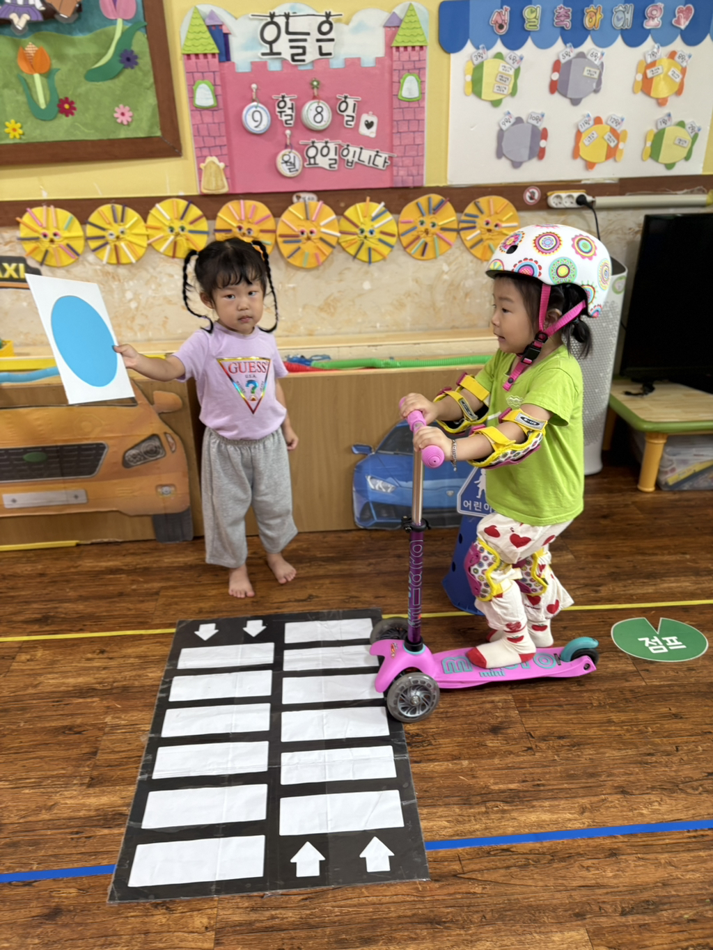 일찍 등원한 사랑둥이들이 ‘킥보드 면허 시험장’ 간판을 만들었어요🛴