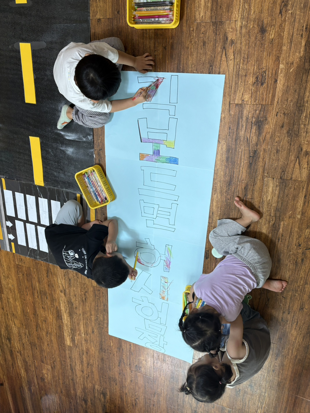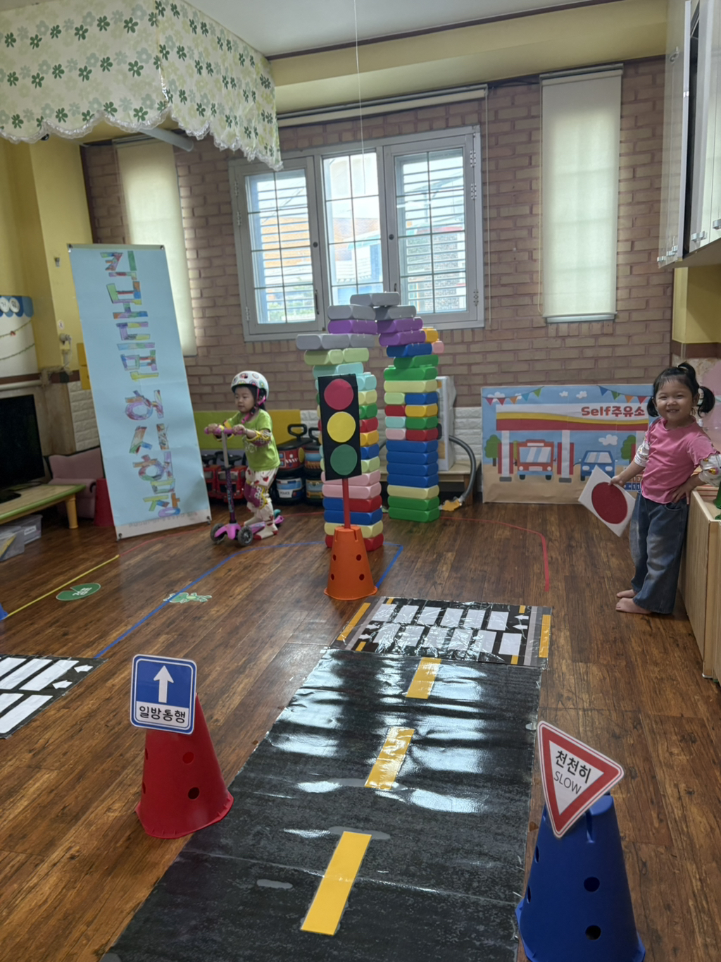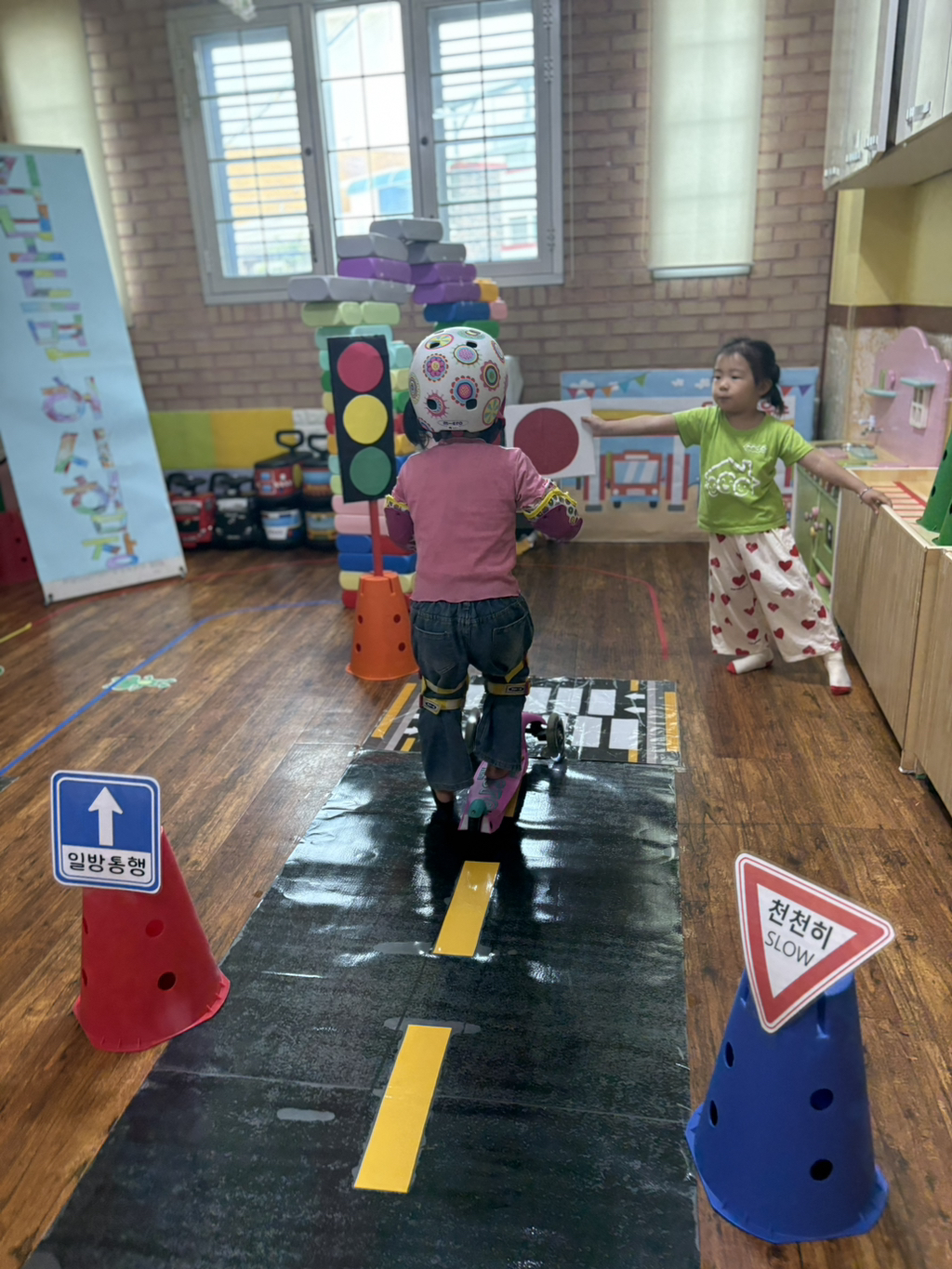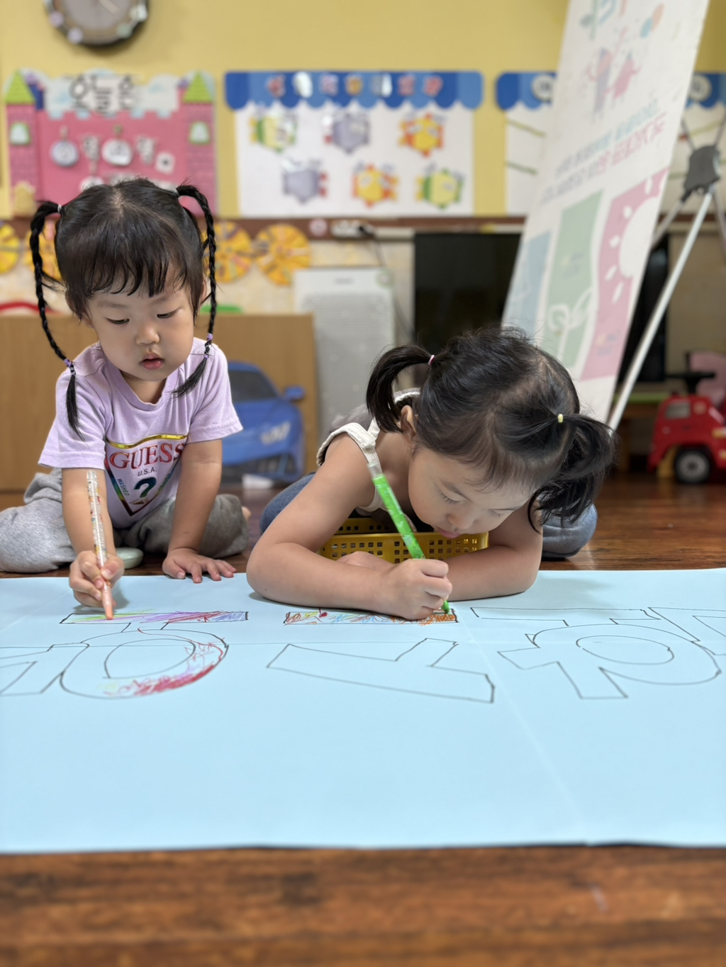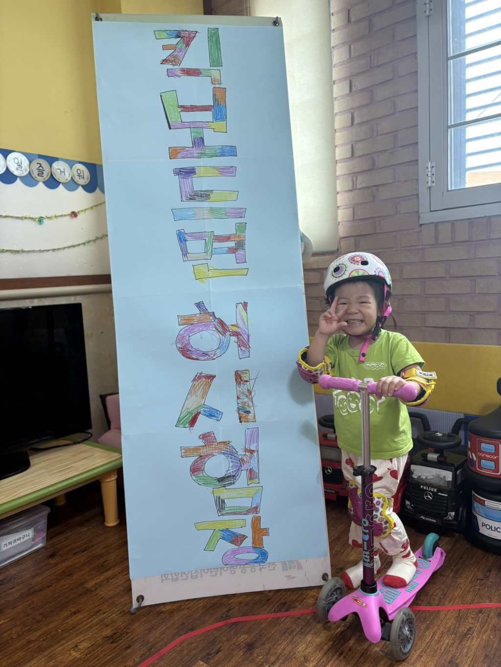 일찍 등원한 사랑둥이들이 ‘킥보드 면허 시험장’ 간판을 만들었어요🛴
